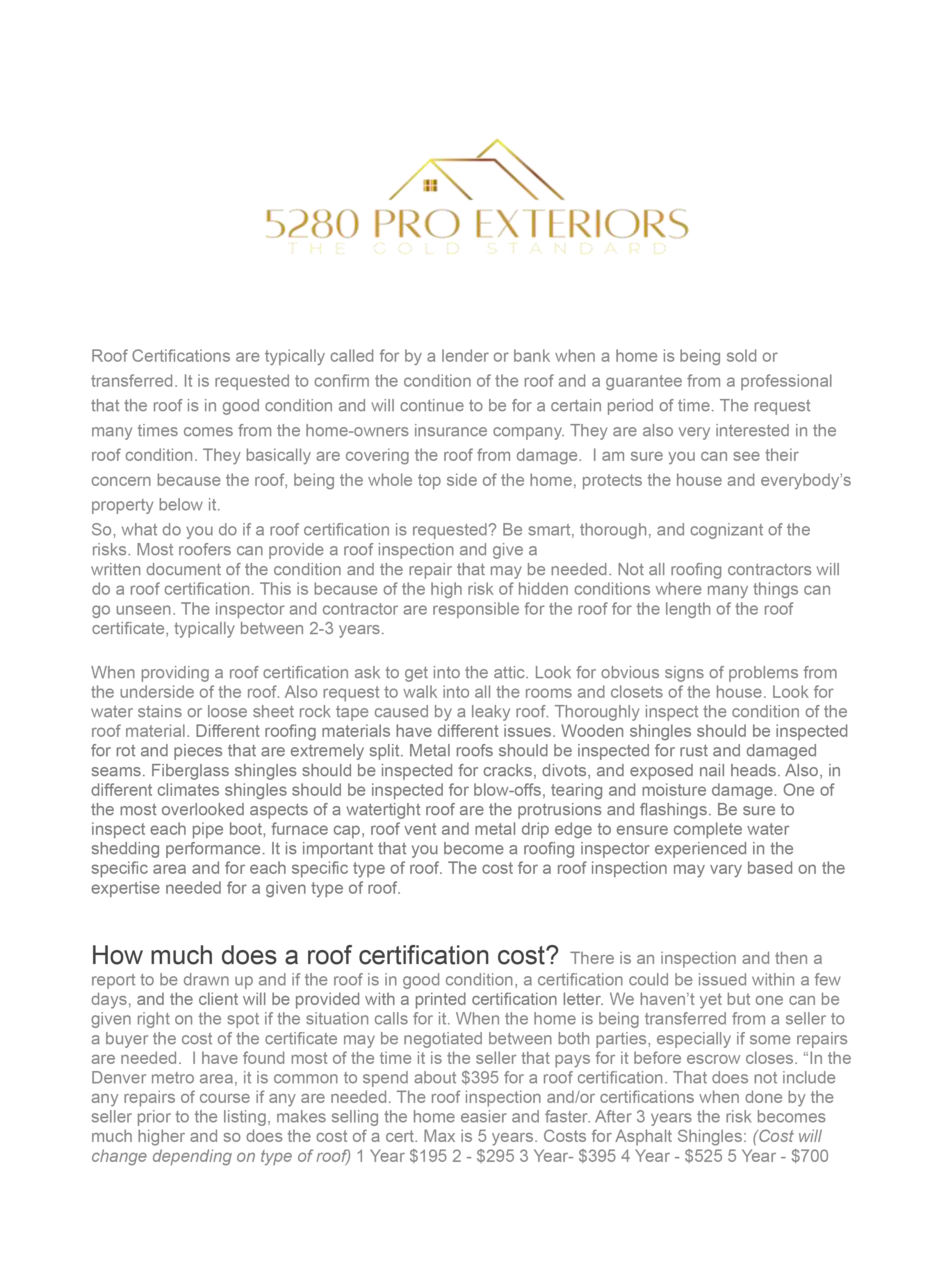 Protect your investment and meet lender and insurance requirements with a professional roof inspection and valid certification for 1 to 5 years. Our certified inspectors perform a comprehensive evaluation of your roofing system and provide official documentation commonly required for real estate transactions in Colorado.